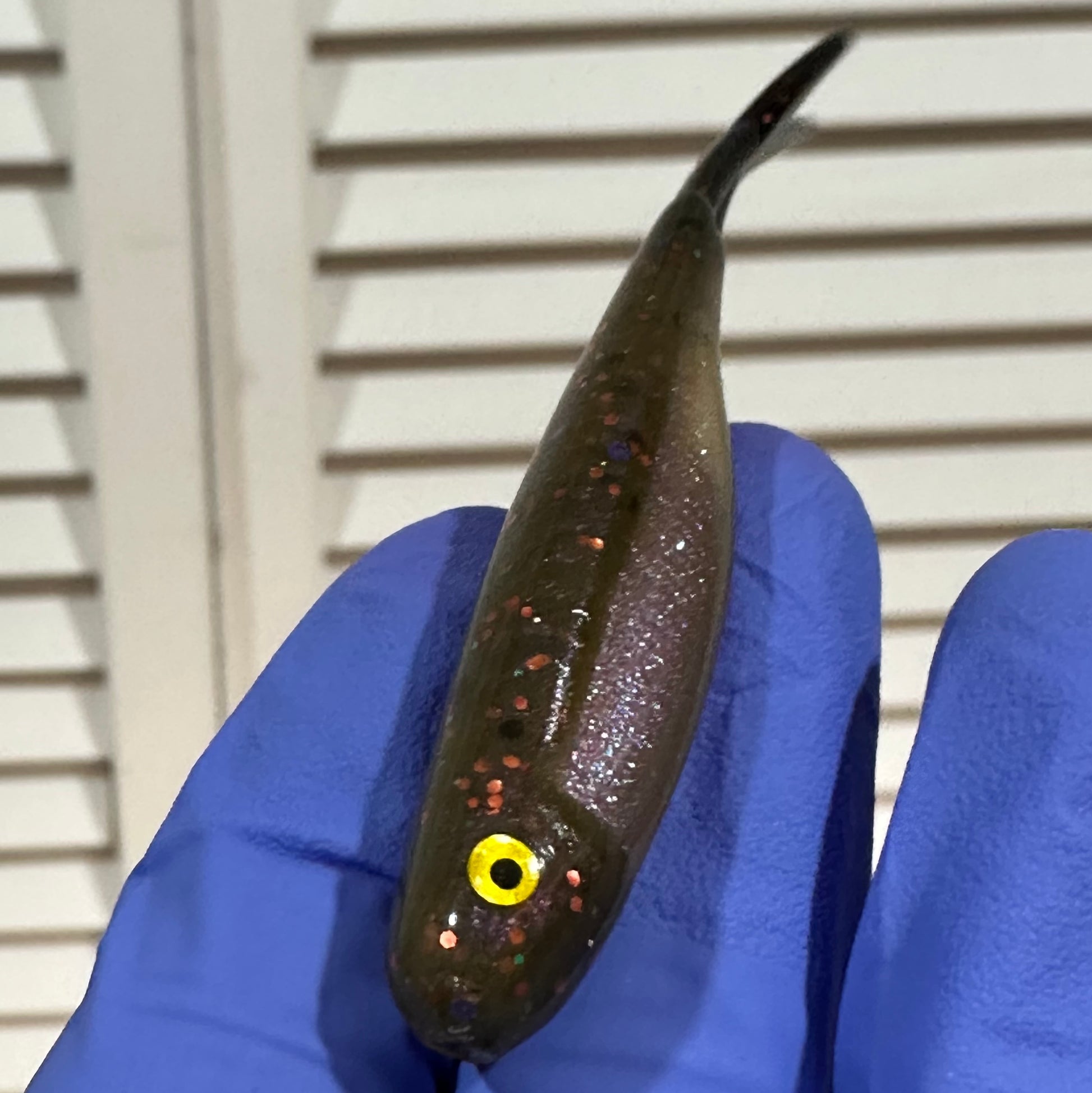 The 3” Crappie Sunrise Minnows feature yellow eyes, a brown top with a blend of orange & blue flake, and a pink belly with tiny blue sparkles. The black tails are scented.
